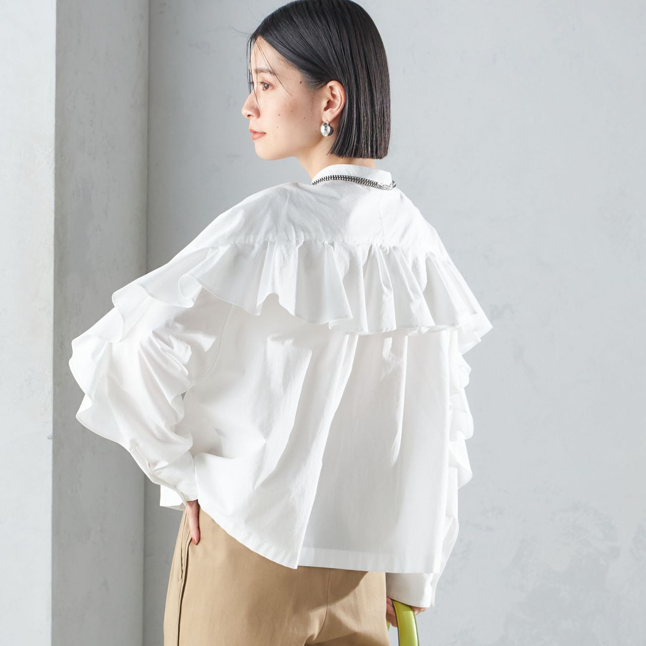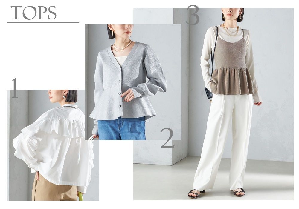 ラッフルが華やかさを演出してくれるので、お手持ちのボトムに合わせるだけでワンランク上のコーディネートに!