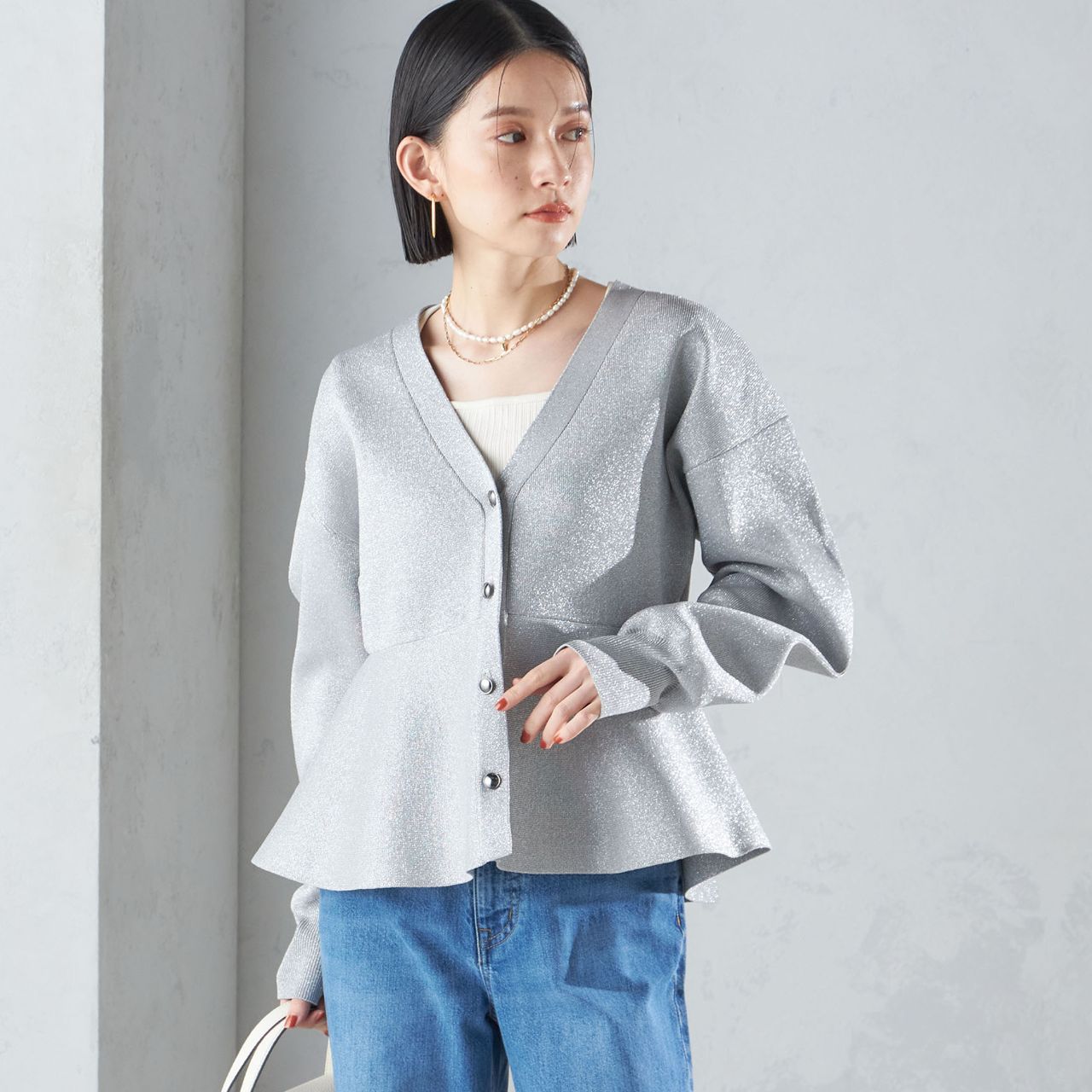 〈手洗い可能〉ラメ ペプラム バナナ スリーブ カーディガン |