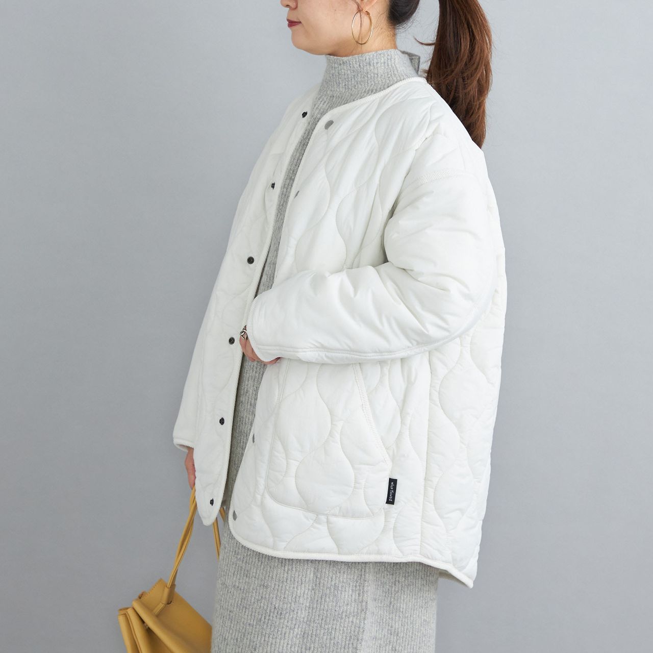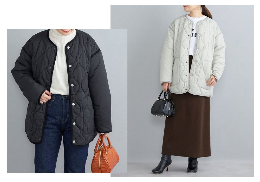 カジュアルになりがちなキルトジャケットですが、袖に丸みをもたせ女性らしい要素をプラス。