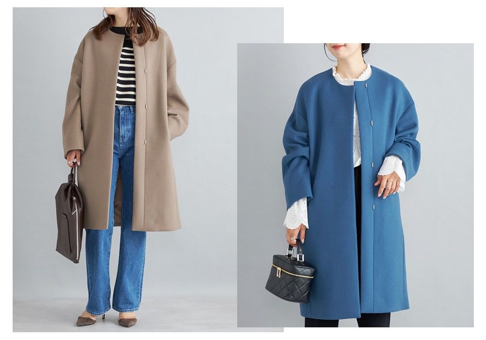 シンプルなデザインがデイリーから通勤まで着回せるノーカラーコート。
