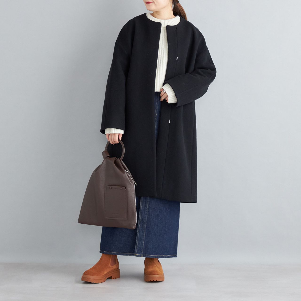 ストールやマフラー、タートルネックなどの防寒アイテムを合わせてももたつかないノーカラーは、寒い日のスタイルでも安心です◎