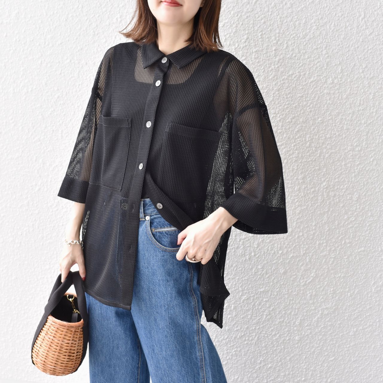 今シーズンも引き続きトレンドの、メッシュ素材のオーバーシャツ。