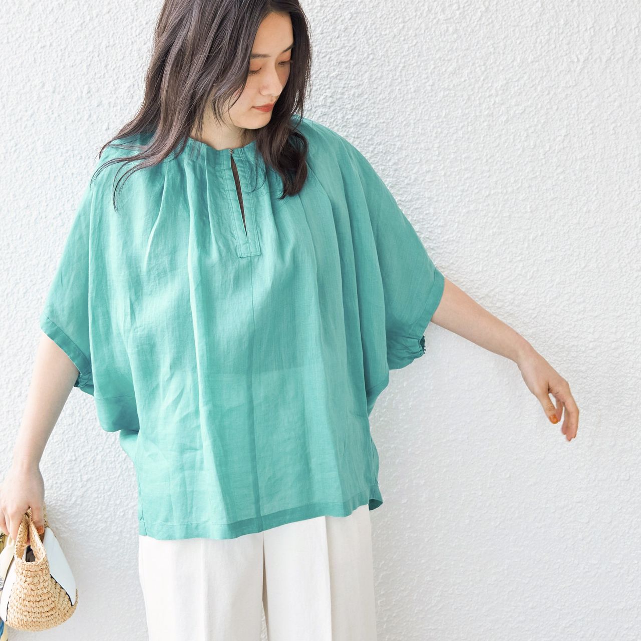 麻素材ながら、きれい見えが叶うドルマンブラウス。