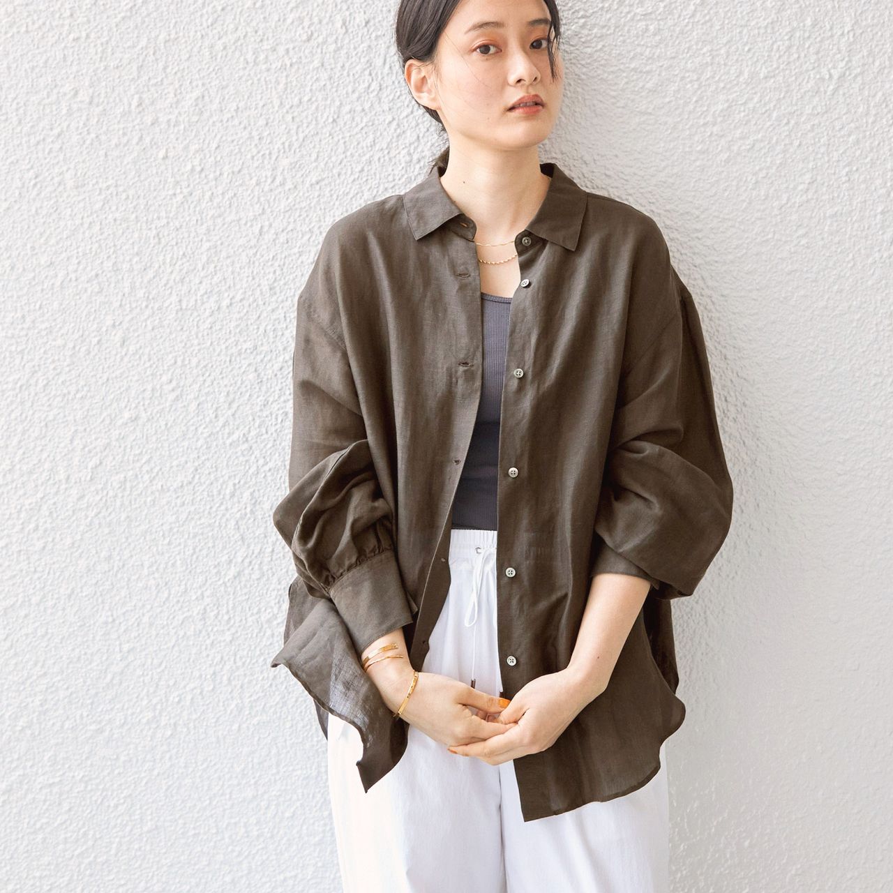 タンクトップ×パンツの上に羽織るだけでスタイリングが決まる万能アイテム。