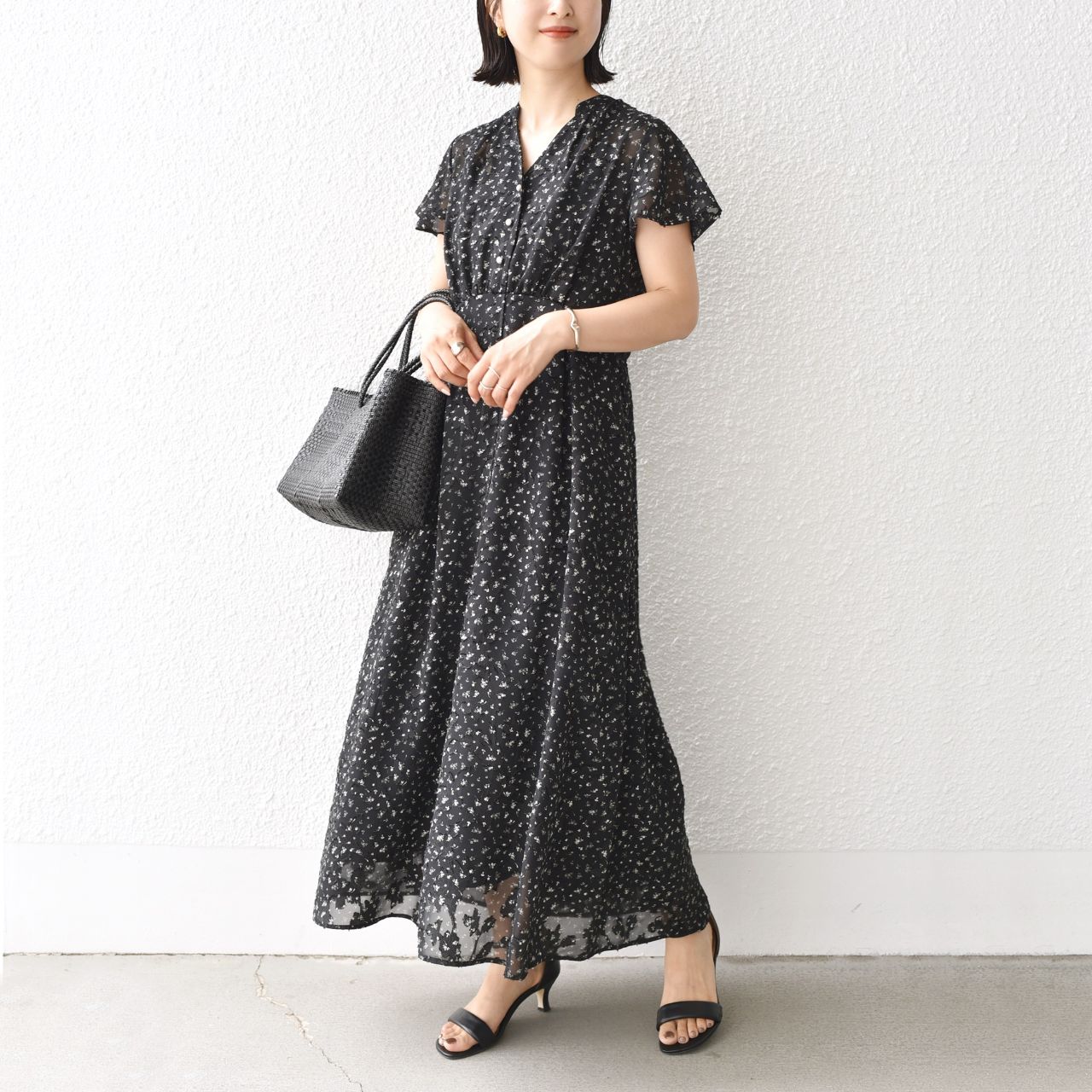 シアーなフラワープリントに、表面感のある生地がニュアンスをプラスしたワンピース。