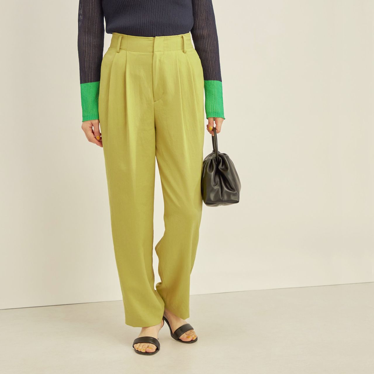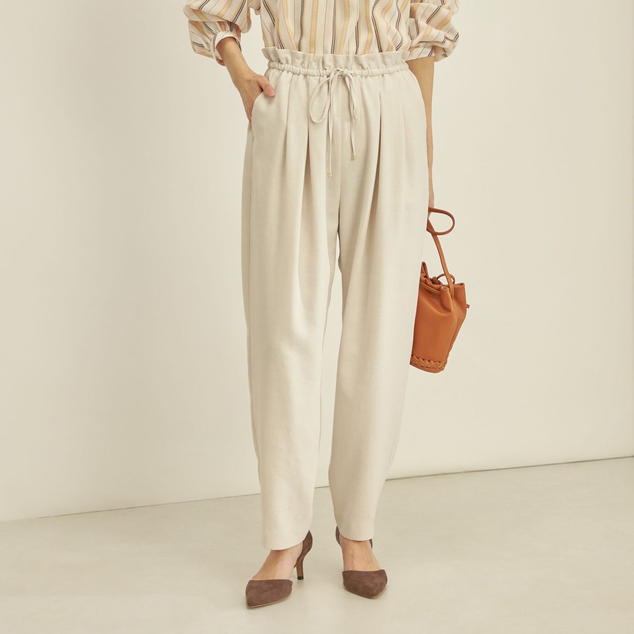 ハイウエストディテールで、美脚効果のあるテーパードパンツ。