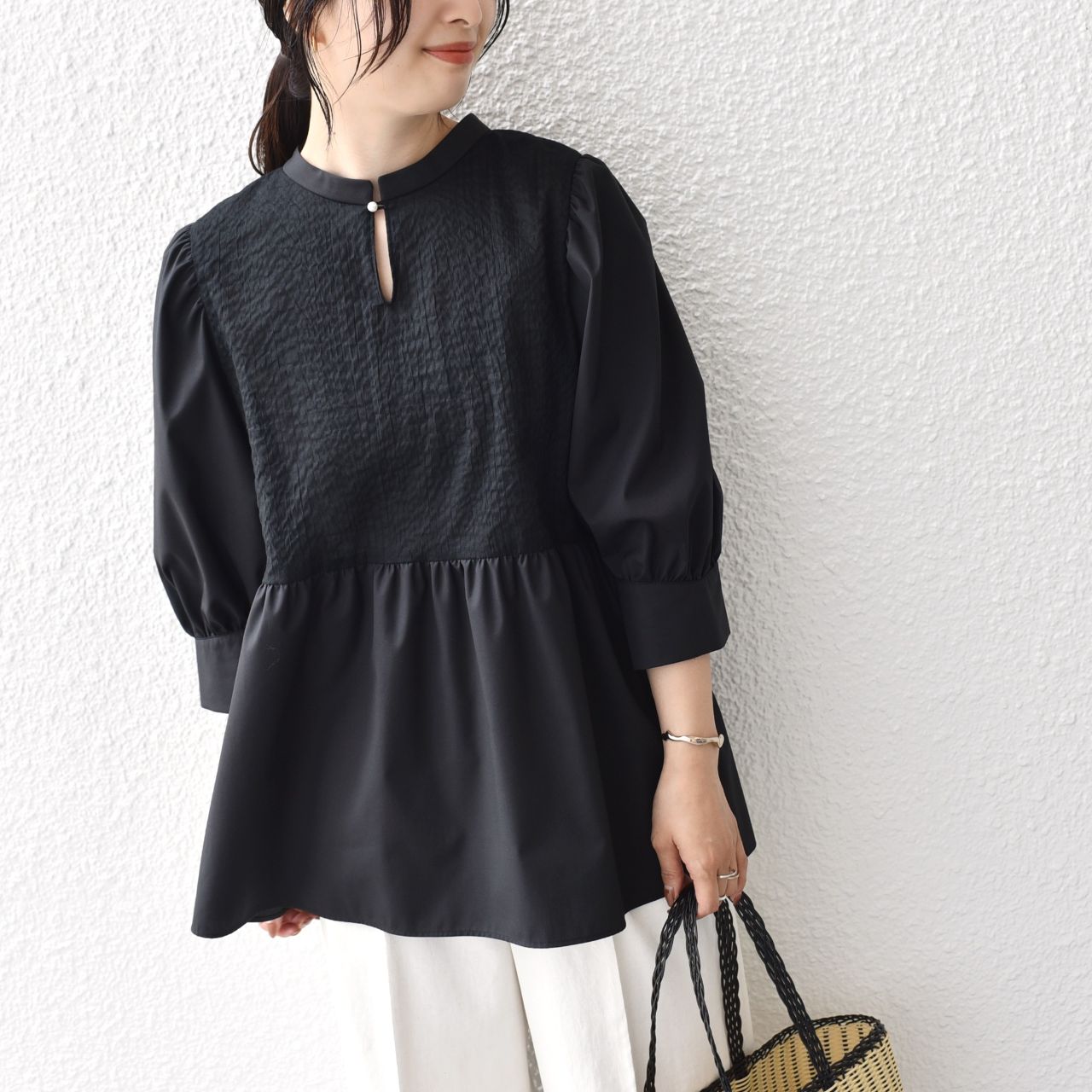 清涼感のあるサッカー生地が、夏に重宝する異素材コンビブラウス。