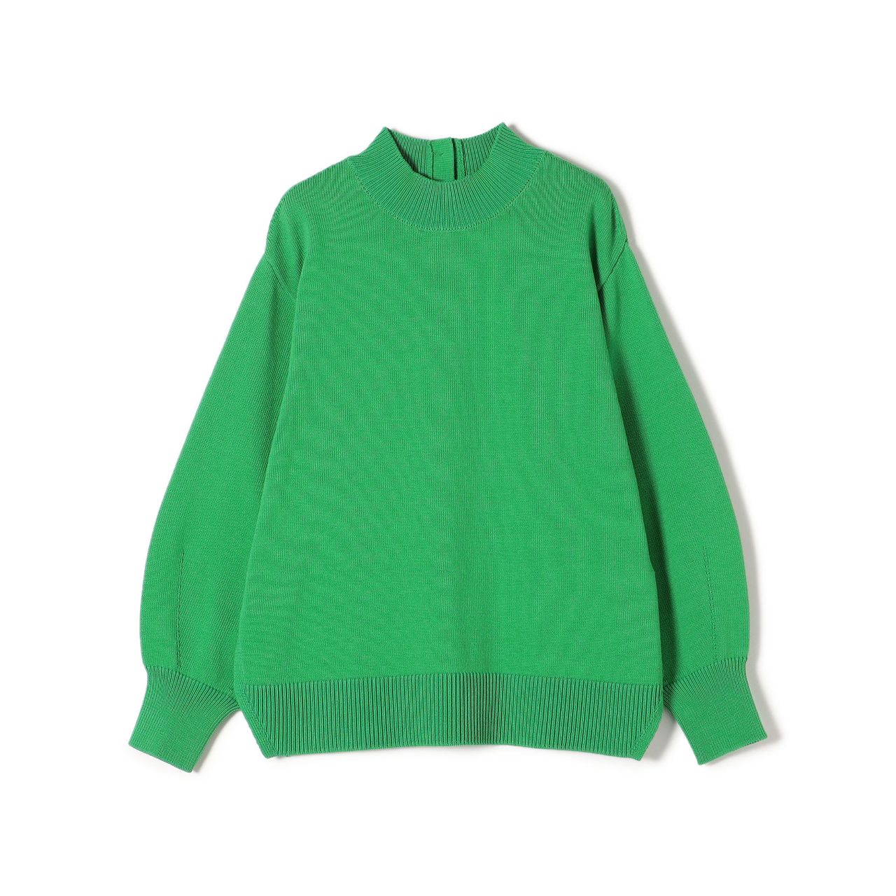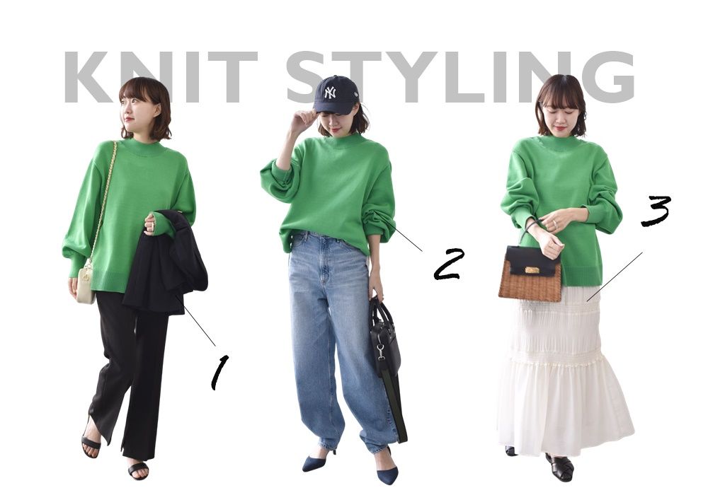 鮮やかなグリーンが目を惹くニットは、シンプルなデザインのボトムを合わせるだけで、スタイリングが決まります。
