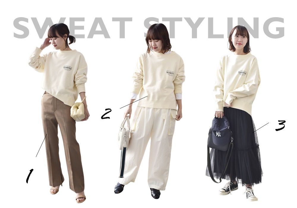 程良いルーズさのあるスウェットには、細身のフレアパンツと合わせてメリハリのあるスタイリングに!