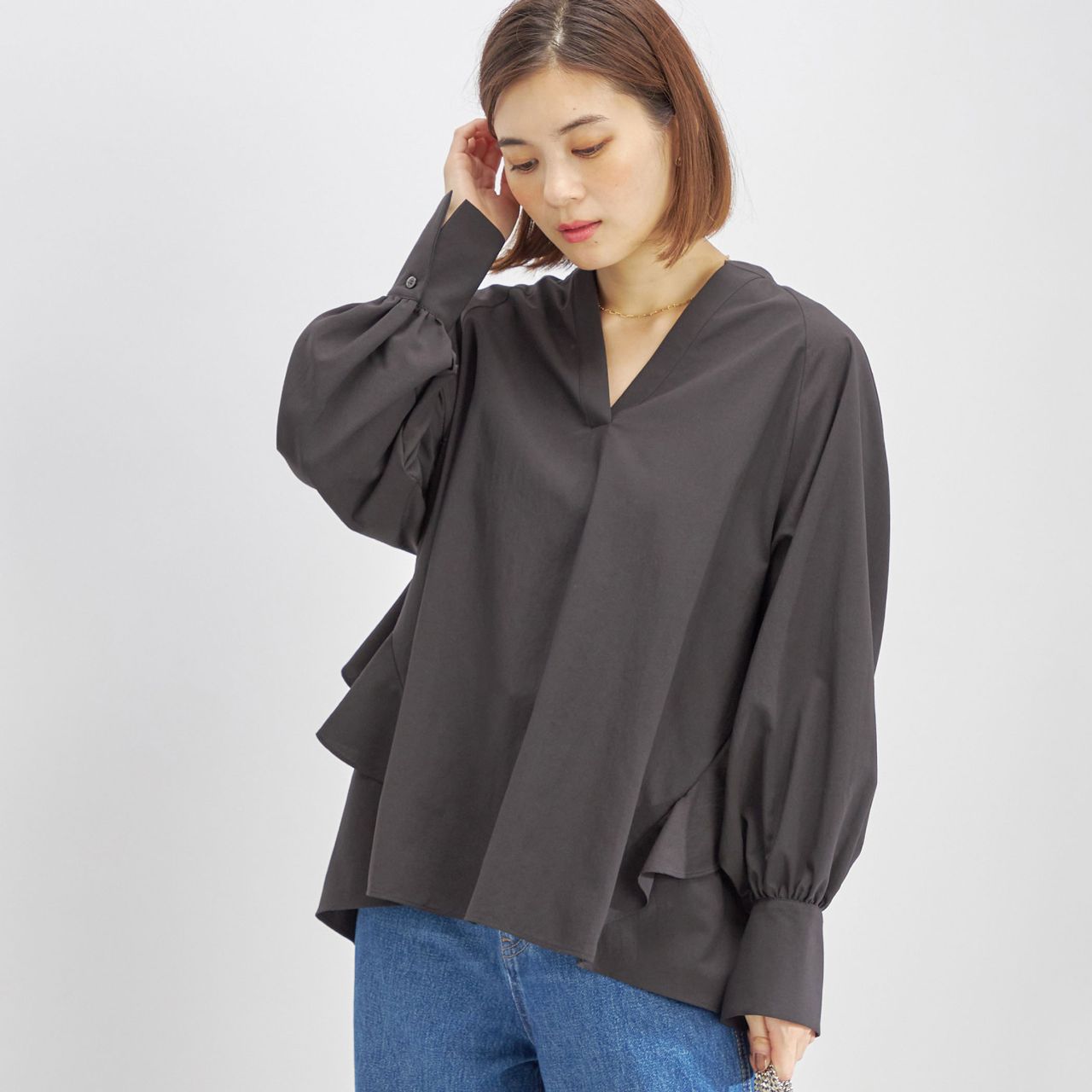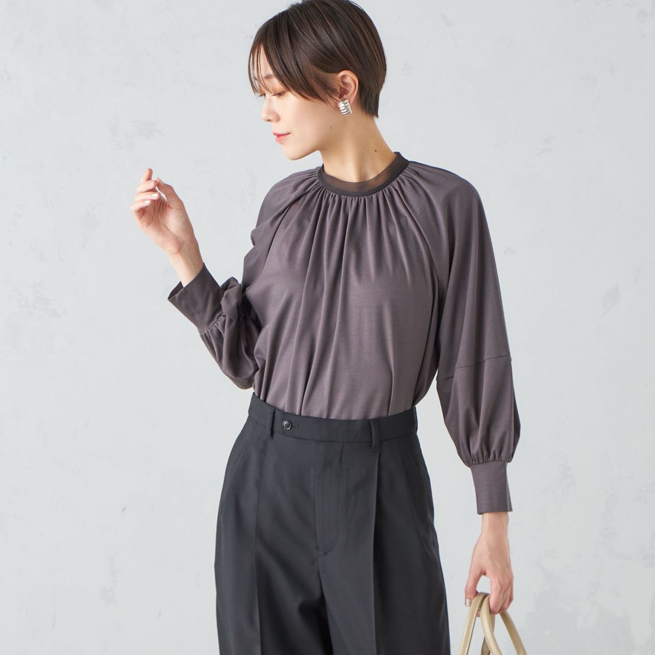 ビジネスシーンにも対応可能なランタンスリーブトップス。