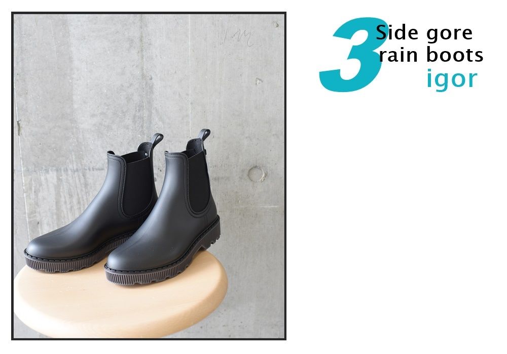 今季引き続きトレンドのサイドゴアのレインブーツ。