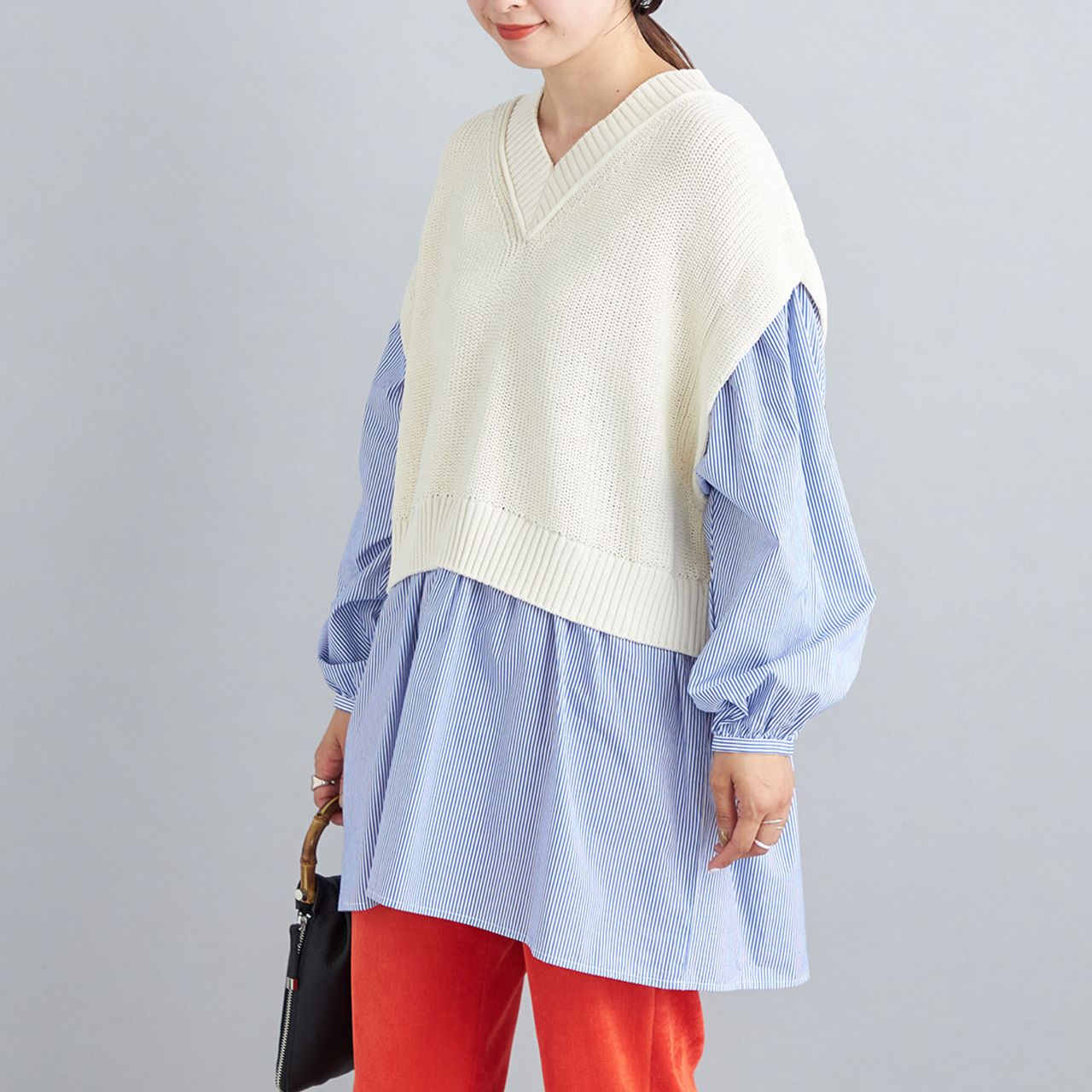 SHIPSでは定番人気の、ニット×シャツコンビのトップス。