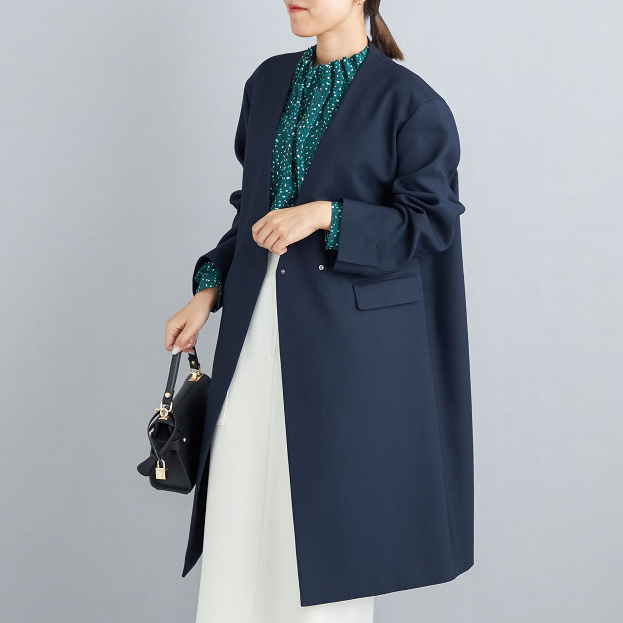 すっきりとしたノーラペルコートは春先の通勤におすすめ!