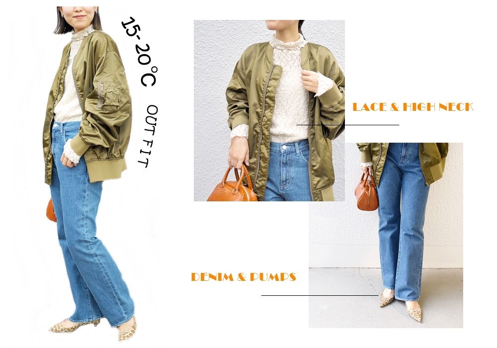 MA-1+デニムのカジュアルアイテムは、レース+パンプスでレディライクに着こなすのがおすすめ。