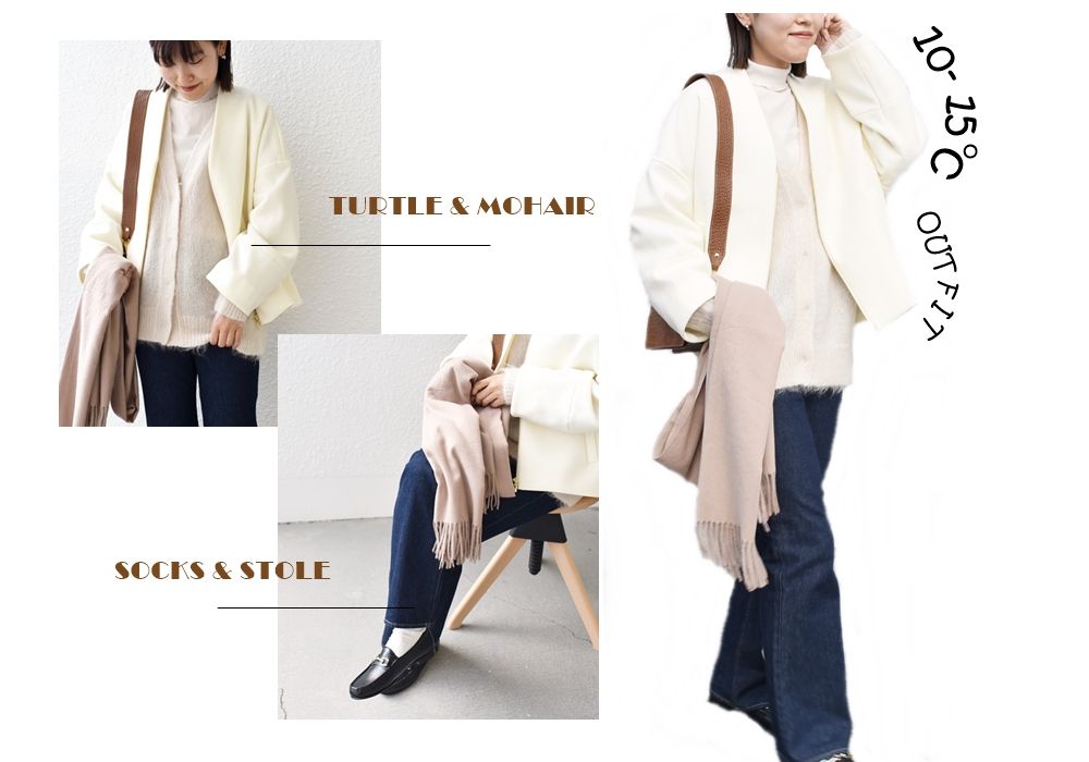 最高気温が10~15℃と冷え込む時期には厚手のメランジニットをイン。